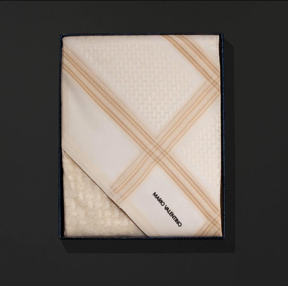 شماغ ماريو فالنتينو أبيض بيج والذي يأتي بخيوط من القطن الصافي والتي تم نسجها وحياكتها بالكامل في ايطاليا، كما أنه يتميز بنقشة مميزة وبتصميم فريد من نوعه يعطي طابع الثقة بالنفس شماغ ماريو فالنتينو يجسد الماضي والحاضر.